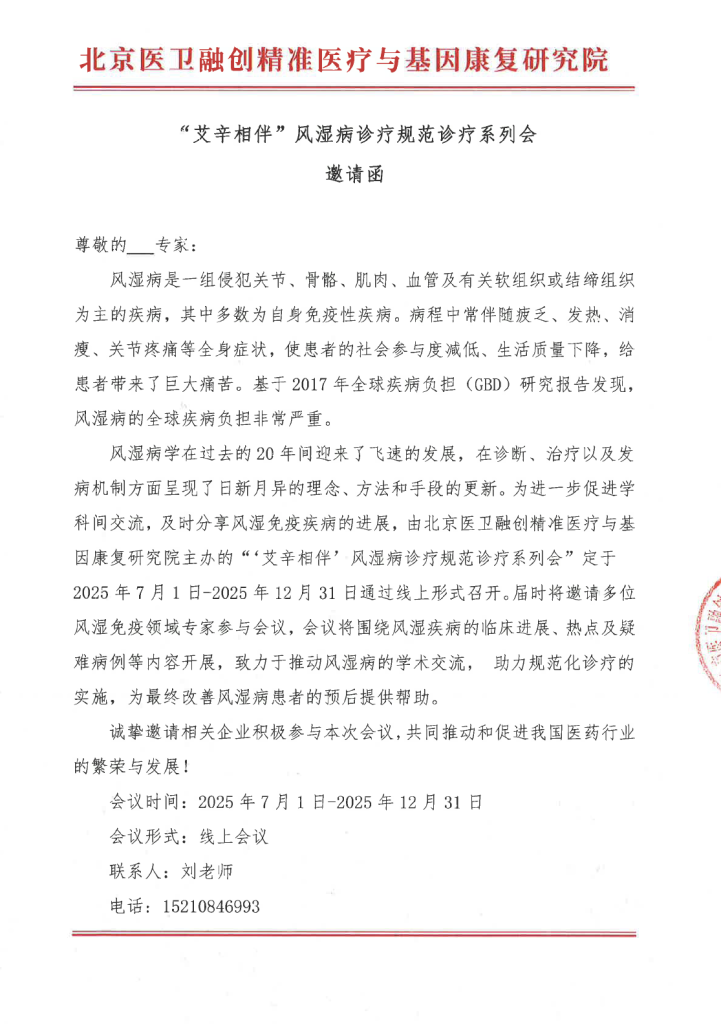 邀请函-“艾辛相伴”风湿病诊疗规范诊疗系列会