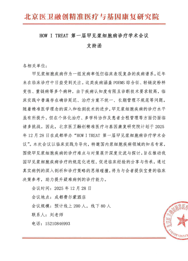 支持函-HOW I TREAT第一届罕见浆细胞病诊疗学术会议