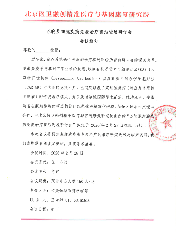 邀请函 苏皖浆细胞疾病免疫治疗前沿进展研讨会