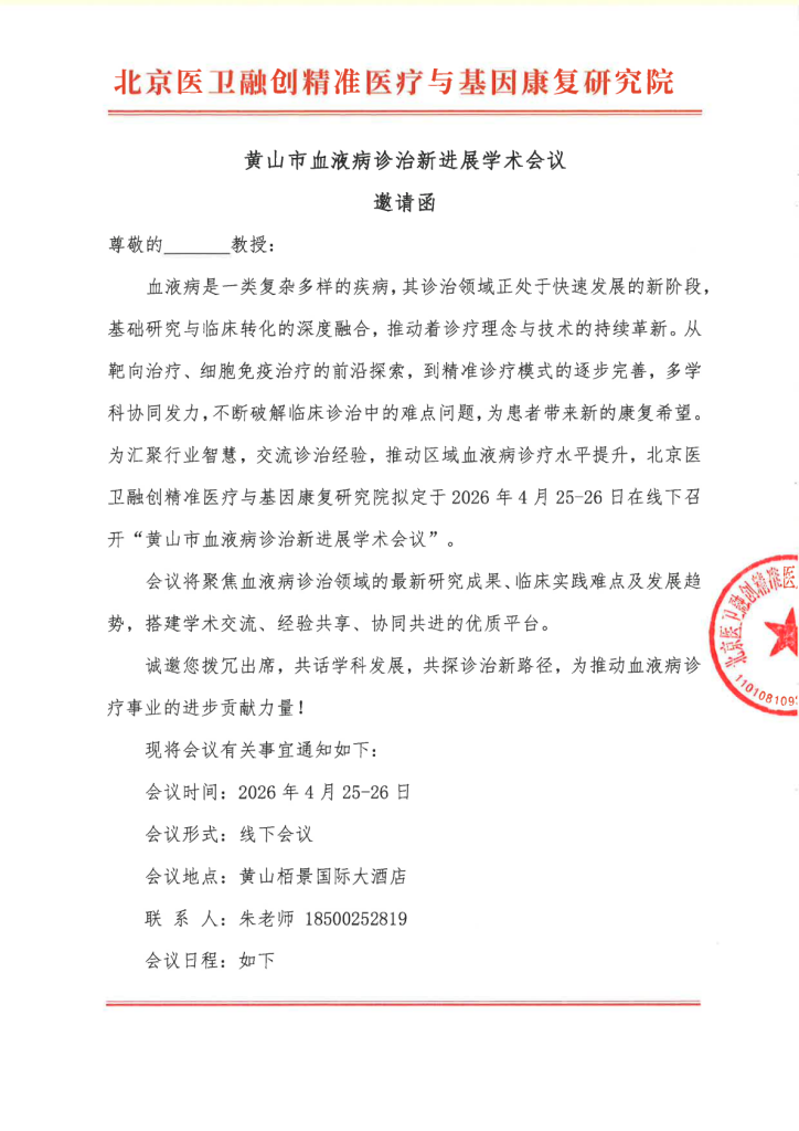 邀请函-黄山市血液诊治新进展学术会议