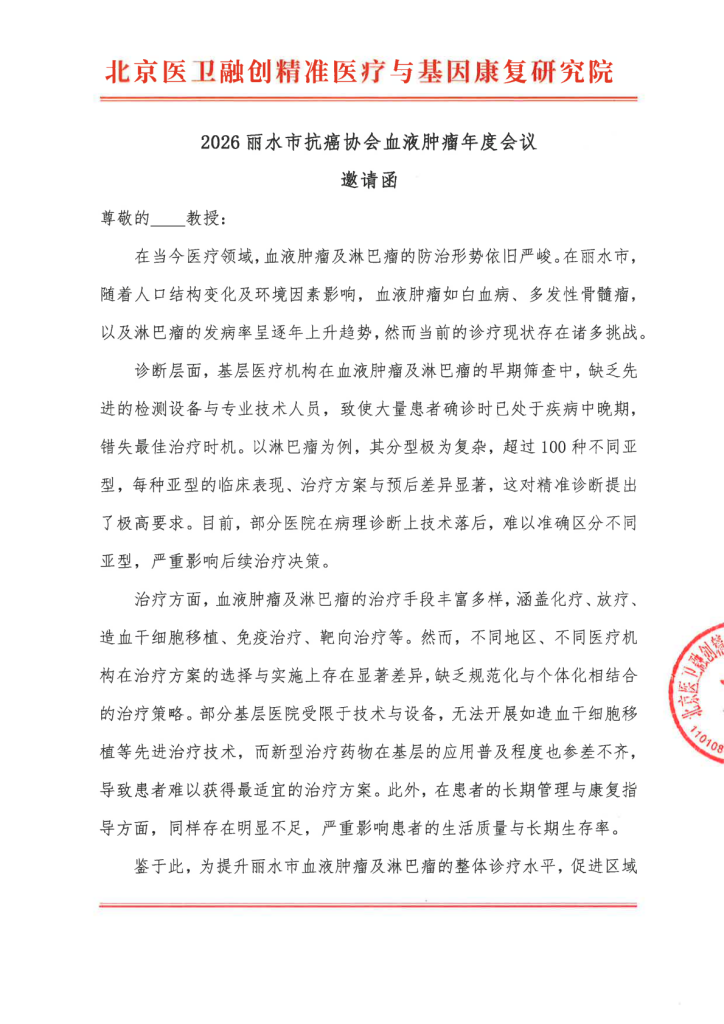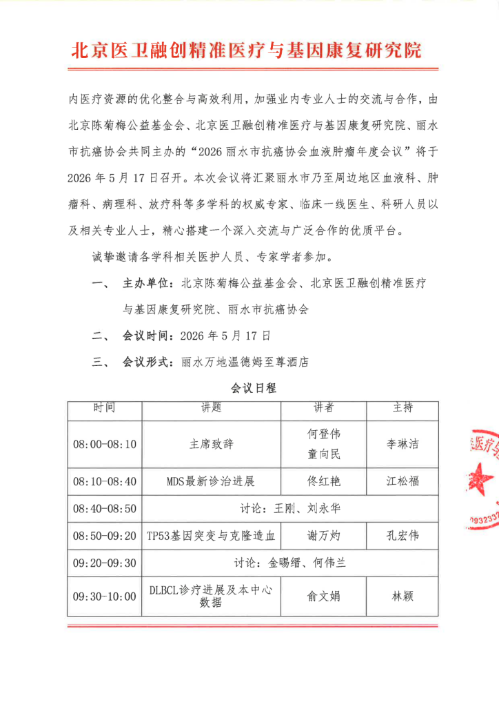 邀请函-2026丽水市抗癌协会血液肿瘤年度会议